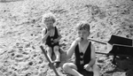 Description :UNE PETITE FILLE ET UN PETIT GARCON SONT ASSIS DANS LE SABLE VETUS D'UN COSTUME DE BAIN. A COTE D'EUX, IL Y A UNE PETITE BROUETTE DE BOIS.
