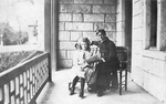 Description :LUCIENNE VERRET VERS L'AGE DE HUIT ANS PREND LA POSE ASSISE DANS UNE CHAISE SUR UNE GALERIE A COTE D'UN PRETRE QUI EST ASSIS SUR UNE CHAISE A COTE D'ELLE; IL LUI MONTRE LE JOURNAL LA PATRIE. L'EDIFICE EST EN BLOCS DE PIERRES.