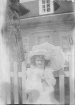 Description :UNE FILLETTE D'CA 4 ANS PREND LA POSE DEVANT UNE CLOTURE EN BOIS DEVANT UNE RESIDENCE ANCIENNE. ELLE PORTE UN CHAPEAU, UNE JOLIE ROBE ET TIENT UNE OMBRELLE.