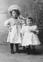 Description :PHOTO DE STUDIO AVEC UN DECOR PEINT. A GAUCHE, LUCIENNE VERRET VERS L'AGE DE 3 ANS, ELLE PORTE UNE ROBE ET UN BERET STYLE MATELOT. A DROITE, IRENE VERRET VERS L'AGE DE DIX-HUIT MOIS AVEC UNE ROBE EN DENTELLE ET MANCHES BOUFFANTES.
