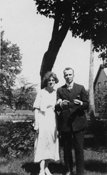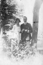 Description :LUCIENNE VERRET TIENT SON MARI, ALBERT DESILETS, PAR LE BRAS. DERRIERE EUX IL Y A DES ARBRES, UNE CLOTURE ET LA FACE LATERALE D'UNE MAISON.