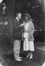 Description :LUCIENNE ET ALBERT SE REGARDENT ET SE SOURIENT. ILS SONT DEBOUT SUR UN GAZON ENTOURE D'ARBRES FEUILLUS.
