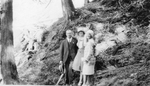 Description :UN HOMME ET DEUX FEMMES PRENNENT LA POSE SUR UN TERRAIN ESCARPE, PARSEME DE BRANCHAGES.