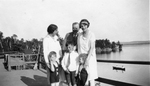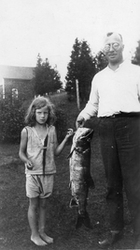 Description :IRENE DESILETS PORTE UN COSTUME DE MATELOT ET EST PIEDS NUS. ELLE TIENT LA TRUITE AVEC SON PERE ALBERT.