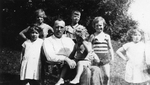 Description :ALBERT DESILETS EST ASSIS A L'EXTERIEUR. IL TIENT SUR SES GENOUX SA FILLE LOUISE. SES AUTRES ENFANTS (ANDREE, IRENE, JEAN ET FRANCOISE) AINSI QUE SA NIECE, DENISE VERGE SONT DEBOUT AUTOUR DE LUI. FRANCOISE EST EN COSTUME DE BAIN. ANDREE EST A ...