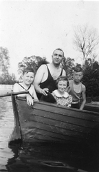Sujet principal :FRANCOISE ET JEAN DESILETS EN CHALOUPE AVEC LEUR ONCLE BLANCHARD ET LEUR COUSIN RENE BLONDIN