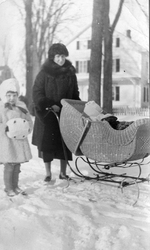 Description :UNE FEMME AVEC A SA DROITE UNE FILLETTE POUSSE UN CARROSSE DANS LA NEIGE. LA FILLETTE PORTE UN MANCHON.