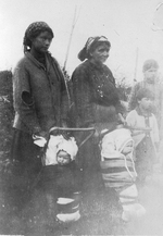 Description :ON VOIT 2 MERES AMERINDIENNES ENTOUREES DE 2 BEBES ET 2 JEUNES ENFANTS AMERINDIENS.