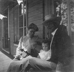 Description :M. ET MME FRANCOIS-XAVIER LEMIEUX SONT ASSIS AVEC LEUR PETITE-FILLE LUCIENNE, ALORS AGEE DE DIX-SEPT MOIS, SUR UNE GALERIE A L'EXTERIEUR D'UNE MAISON. L'ENFANT EST APPUYEE SUR L'HOMME ET LA GRAND-MERE LA REGARDE TENDREMENT.