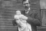 Description :M. HECTOR VERRET PORTANT VESTON ET COL MONTE TIENT DANS SES BRAS UN BEBE ENVELOPPE DE LANGES. LA PHOTO EST PRISE A L'EXTERIEUR D'UNE MAISON.