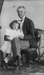Description :UN HOMME D'CA CINQUANTE ANS PREND LA POSE AVEC UNE PETITE FILLE D'CA 4 ANS. IL EST ASSIS SUR UNE CHAISE REMBOURREE AVEC UNE FRANGE; IL PORTE UN VESTON ET UNE CHEMISE A COLLET MONTE ET DES BOTTINES; ET DEBOUT, APPUYEE SUR SES CUISSES, UNE PETIT...