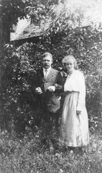 Description :LUCIENNE VERRET PREND LA POSE AVEC SON PERE HECTOR. ELLE LE TIENT PAR LE BRAS. ILS SONT DEBOUT DEVANT UNE MAISON AU TOIT DE BARDEAUX, CACHEE PAR DES FEUILLUS.