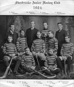Description :8 JEUNES JOUEURS DE HOCKEY PRENNENT LA POSE EN UNIFORME (CHANDAIL RAYE, COLLANT EN LAINE ET CULOTTES COURTES) CHAUSSES DE LEURS PATINS ET TENANT LEUR HOCKEY. TROIS JEUNE HOMMES PLUS AGES EN VESTON, NOEUD PAPILLON, CRAVATE, POSENT AVEC EUX. C'E...