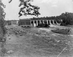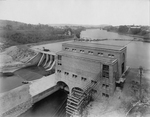 Description :GROS PLAN SUR UNE CENTRALE HYDRO-ELECTRIQUE. A GAUCHE, LE BARRAGE ET DERRIERE LA CENTRALE, LE BASSIN DE RETENUE. A L'ARRIERE-PLAN, LE VILLAGE DE MAGOG OU L'ON DISTINGUE LE CLOCHER DE L'EGLISE.