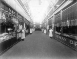 Description :INTERIEUR DU MARCHE LANSDOWNE SUR LA RUE KING OUEST. ON VOIT L'ALLEE CENTRALE ET DE CHAQUE COTE DES COMMERCANTS EN TABLIERS BLANCS ET PORTANT CASQUETTES, DEBOUT DEVANT LEUR BOUCHERIE. DE NOMBREUX MORCEAUX DE VIANDES DE TOUTES SORTES, DES CHARC...