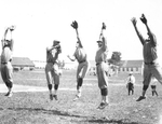 Description :AU 1ER PLAN, CINQ JOUEURS DE BASEBALL SAUTANT DANS LES AIRS POUR ATTRAPER LA BALLE. DERRIERE EUX, A DROITE, UN AUTRE JOUEUR EN ACTION ET DEUX ENFANTS. EN ARRIERE PLAN, DES BATIMENTS ET DES AUTOMOBILES; AU CENTRE, L'ARRIERE DE L'ESTRADE DU TERR...
