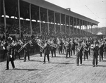 Description :LA FANFARE L'HARMONIE DE SHERBROOKE DEFILANT SUR LA PISTE DE COURSE DEVANT LA GRANDE ESTRADE REMPLIE DE MONDE DE L'EXPOSITION AGRICOLE DE SHERBROOKE.