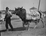 Description :GROS PLAN SUR UN BOEUF RECOUVERT D'UNE COUVERTURE OU SONT EPINGLES PLUSIEURS PRIX. LE BOEUF EST GUIDE PAR UN HOMME TENANT UN BATON ACCROCHE AU MUSEAU DU BOEUF PAR UN ANNEAU. AU SECOND PLAN, A GAUCHE, DES PERSONNES REGARDENT LE DEFILE DERRIERE ...