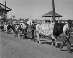 Description :AU 1ER PLAN, DEFILE DE BOVINS OU LE PREMIER EN LIGNE EST RECOUVERT DE NOMBREUX PRIX ET D'UNE AFFICHE OU IL EST ECRIT: "BANKS-JOHN HARVEY-FRELICHSBURG - QUE. - 3,200 LVRES". DES HOMMES GUIDENT LES BOVINS PAR UN BATON ACCROCHE A LEURS MUSEAUX PA...