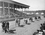 Description :COURSE DE CHEVAUX OU L'ON VOIT 5 CHEVAUX ET LEURS CONDUCTEURS SUR LA PISTE DE COURSE DEVANT LA GRANDE ESTRADE REMPLIE. EN BAS, A DROITE, UNE PARTIE DES MUSICIENS DE LA FANFARE "L'HARMONIE DE SHERBROOKE" SUR LA PLATE-FORME DES SPECTACLES. A L'A...