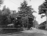 Description :VUE SUR LA RUE MELBOURNE (DE CRESSE VERS QUEEN) AVEC AU CENTRE DES RAILS DE TRAMWAYS. A GAUCHE, UNE PARTIE DE LA MAISON BECKETT OU L'ON APERCOIT SEULEMENT LA TOUR CARREE, LE RESTE EST CACHE PAR LES ARBRES. A DROITE, UNE SERIE D'HABITATIONS EN ...