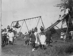Description :UNE VINGTAINE D'ENFANTS AGES ENTRE 5 ET 10 ANS ENVIRON DANS UN PARC. IL Y A DES BALANCOIRES ET UNE GLISSADE OU S'AMUSENT LES ENFANTS. LA PLUPART DES ENFANTS ONT UN CHAPEAU: CHAPEAU DE PAILLE, CASQUETTE, CHAPEAU-CLOCHE.