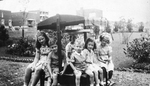 Description :LES ENFANTS DE GEORGES SYLVESTRE TOUS ASSIS SUR UN BANC A L'EXTERIEUR DANS LA COUR DE LEUR MAISON SUR LA RUE MURRAY. DE GAUCHE A DROITE, THERESE, PIERRE, JEAN, GABRIELLE ET MARGUERITE (L'AINE, JACQUES, NE FIGURE PAS SUR LA PHOTO). DERRIERE CEU...