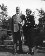 Description :A GAUCHE, GEORGES SYLVESTRE EN HABIT, AVEC SON MANTEAU SUR SON BRAS GAUCHE ET A DROITE, SON EPOUSE MARGUERITE SYLVESTRE (ST-JEAN) SON SAC A MAIN SOUS SON BRAS GAUCHE. ELLE EST HABILLEE D'UN TAILLEUR ET D'UNE JUPE FONCEE. LA PHOTO EST PRISE A L...