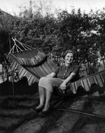 Description :MME MARGUERITE SYLVESTRE (ST-JEAN), EPOUSE DE GEORGES SYLVESTRE, ASSISE DANS UN HAMAC SE BALANCANT EN RIANT. ELLE EST HABILLEE D'UNE JUPE EN BAS DES GENOUX ET D'UN CHEMISIER. DERRIERE ELLE, IL Y A DES ARBUSTES.