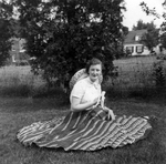 Description :MARGUERITE SYLVESTRE ASSISE PAR TERRE SUR L'HERBE, HABILLEE D'UNE JUPE ET D'UN LEGER MANTEAU, UN SAC A MAIN SES GENOUX. DERRIERE ELLE, UNE CLOTURE ET UNE RANGEE DE SAPINS.