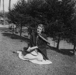 Description :GABRIELLE SYLVESTRE ASSISE PAR TERRE SUR L'HERBE, HABILLEE D'UNE JUPE CIRCULAIRE ETALEE AUTOUR D'ELLE, D'UNE BLOUSE BLANCHE ET D'UN GRAND CHAPEAU ATTACHE DANS LE DOS. ELLE TIENT DANS SA MAIN DROITE UNE BANANE. DERRIERE ELLE, UNE CLOTURE, DES A...