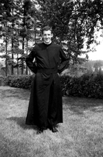 Description :MICHEL MURRAY PORTANT UNE SOUTANE, LES MAINS DANS LE DOS, DEVANT UN BOSQUET.