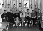 Description :1.1: MEMBRES DU CLUB HILLCREST REUNIS A L'OCCASION D'UNE FETE POUR LES CHAMPIONS DE LA SAISON 1948-1949. ILS POSENT A L'INTERIEUR. EN AVANT, DANS L'ORDRE HABITUEL: ROGER THERRIEN, GORDON HARMER, FERNAND ROBERT, ERIC SCHILLER, INSTRUCTEUR, ? ST...