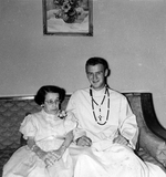 Description :ASSIS SUR UN DIVAN, A DROITE JEAN SYLVESTRE EN HABIT DE NOVICIAT CHEZ LES PERES BLANCS ET A GAUCHE MARIE SYLVESTRE, LA SOEUR DE GEORGES DANS LA MAISON D'ERNEST SYLVESTRE (LE PERE DE GEORGES ET DE MARIE). LA MAISON EST SITUEE AU COIN DE GILLESP...