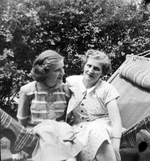 Description :MARGUERITE ASSISE SUR UNE CHAISE DE PARTERRE ET THERESE ASSISE SUR LE BRAS DE LA CHAISE, LA MAIN SUR L'EPAULE DE SA SOEUR. C'EST L'ETE ET ELLES PORTENT DES ROBES FLEURIES. EN ARRIERE-PLAN, LA COUR DE LA MAISON FAMILIALE.