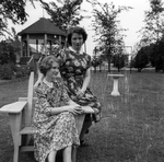 Description :A DROITE MME MARGUERITE SYLVESTRE (ST-JEAN) ET A GAUCHE SA FILLE MARGUERITE, LE VISAGE TOURNE VERS SA MERE ET LUI SOURIANT. ELLES SONT ASSISES DANS UN HAMAC. DERRIERE IL Y A DES ARBRES.