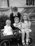 Description :QUATRE ENFANTS DE GEORGES SYLVESTRE PHOTOGRAPHIES A L'EXTERIEUR. ASSIS DANS UNE VOITURETTE, A GAUCHE MARGUERITE, AU CENTRE, PIERRE QUI A SUR LES GENOUX UN PETIT PANIER AVEC UN CHAT DEDANS, A DROITE, THERESE FLATTANT LE CHAT. DERRIERE EUX, JACQ...