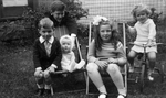 Description :CINQ DES SIX ENFANTS DE GEORGES SYLVESTRE PHOTOGRAPHIES A L'EXTERIEUR. A GAUCHE, PIERRE ASSIS SUR LE BORD D'UNE CHAISE DE PARTERRE; PARTAGEANT LA MEME CHAISE, GABY; THERESE ASSIS AUSSI SUR UNE CHAISE DE PARTERRE; A DROITE MARGUERITE ASSISE SUR...