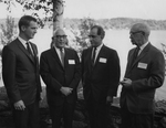 Description :QUATRE HOMMES PHOTOGRAPIES A L'EXTERIEUR. DE GAUCHE A DROITE, 1ER JEAN SYLVESTRE, 2E PAUL-EMILE SAVARD (?), 4E PAUL SYLVESTRE. ILS ONT DES INSIGNES INDIQUANT LEURS NOMS A LEUR VESTON. DERRIERE EUX IL Y A DES ARBRES.