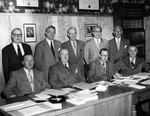 Description :GROUPE DE NOTAIRES LORS D'UNE REUNION PRELIMINAIRE DU CONSEIL DE LA CHAMBRE AU PALAIS DE JUSTICE DE SHERBROOKE. DANS LA 1ERE RANGEE, ASSIS, DE GAUCHE A DROITE, ON VOIT EMILE BOITEAU DE QUEBEC, VICE-PRESIDENT; GEORGES SYLVESTRE DE SHERBROOKE, P...