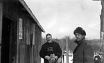 Description :AU CENTRE, PRES D'UNE CABANE EN BOIS, GEORGES SYLVESTRE HABILLE D'UN CHANDAIL OU IL EST ECRIT: "HILLCREST-SKI CLUB-SHERBROOKE" ET COIFFE D'UNE TUQUE. ON VOIT LE HAUT DE SES BATONS DE SKI PRES DE LUI. A DROITE, IL Y A UN HOMME COIFFE D'UN CASQU...