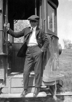 Description :VUE LATERALE DU DEVANT D'UN TRAMWAY AVEC UN HOMME SUR LA MARCHE DE L'ENTREE. A L'ARRIERE PLAN, UN CHAMP.