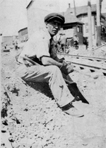 Description :TRAVAILLEUR ASSIS SUR LE BORD DU CHEMIN DE FER QUI TRAVERSE LA RUE ALEXANDRE, PRES D'ABERDEEN, LORS DE LA CONSTRUCTION DE LA LIGNE DE TRAMWAY SUR ALEXANDRE. EN ARRIERE-PLAN, D'AUTRES TRAVAILLEURS.