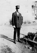 Description :HOMME EN HABIT ET CASQUETTE DE CONDUCTEUR DE TRAMWAY DEBOUT PRES D'UN EDIFICE A DEUX ETAGES.