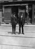 Description :3.1: DEUX HOMMES DEBOUT DANS LA RUE DEVANT "ALLAIRE ET LEBLANC" SUR LA RUE WELLINGTON NORD. L'HOMME DE GAUCHE EST HABILLÂ EN CIVIL ET CELUI DE DROITE PORTE UN HABIT DE CONDUCTUER DE TRAMWAY. A LEURS PIEDS, ON PEUT VOIR LES RAILS DE TRAMWAY. 3...