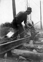 Description :4.1: DEUX HOMMES EN TRAIN D'INSTALLER UN RAIL SUR DES TRAVERS DE BOIS 4.2: GROUPE D'HOMMES VUS DE DOS, PELLE A LA MAIN, EN TRAIN DE REMETTRE DE LA TERRE ENTRE LES RAILS APRES LES AVOIR POSES. AU LOIN PEUT ETRE LE MONT BELLEVUE.