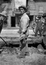 Description :5.1; QUATRE HOMMES AU TRAVAIL ARRETENT POUR REGARDER LA CAMERA.L'UN TIENT UN MAILLET ET NOUS REGARDE. DERRIERE EUX LA RUE ET UNE EPICERIE ANNONCANT LES CIGARETTE "SWEET CAPORAL". 5.2: GROUPE D'HOMMES AU TRAVAIL CERTAINS SONT LES MEMES QU'EN 5....