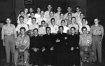 Description :GROUPE DE MONITEURS DE L'O.T.J. AVEC CHEMISES BLANCHES ET FOULARDS QUI LES DISTINGUENT. DANS LA 1ERE RANGEE IL Y A QUATRE ABBES EN SOUTANE. DANS LA 1ERE RANGEE, LA 5E PERSONNE EST L'ABBE DESEVE CORMIER ET LA DERNIERE PERSONNE A DROITE EST JEAN...
