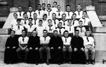 Description :GROUPE DE JEUNES DE L'O.T.J. POSE DEVANT LA BIBLIOTHEQUE MUNICIPALE. DE GAUCHE A DROITE, 1ERE RANGEE: YVAN RICHARD (DEBOUT), ALBERT GOBEIL, L'ABBE ARTHUR VEILLEUX, L'ABBE DESEVE CORMIER, L'ABBE BRUNO LAVIGNE, MGR GEORGES CLOUTIER, ROGER PELLET...