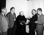 Description :JOS. BLAIS RECEVANT EN CADEAU UNE MAGNIFIQUE CANNE POUR FETER SES 40 ANS COMME MEMBRE DE LA CHORALE ST-JEAN-BAPTISTE. DE GAUCHE A DROITE, OSCAR CARTIER. PROFESSEUR DE PIANO ET D'ORGUE; GEORGES SYLVESTRE, EX-DIRECTEUR DE LA CHORALE; LE CHANOINE...